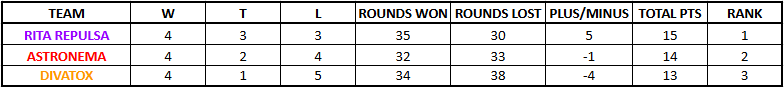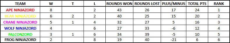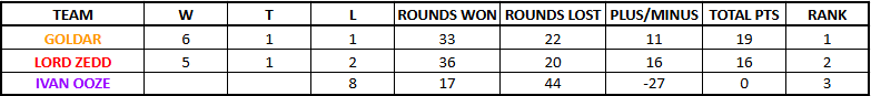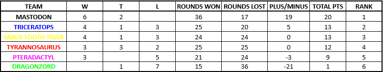 Points are awarded for wins (3 points), ties (1 point) and losses (0 points). In the event of a tie, tiebreakers will be calculated as follows: